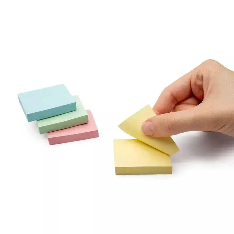 Cada conjunto vem com 4 blocos em tons suaves, medindo 38 mm x 50 mm, com 100 folhas adesivas cada, perfeitas para recados, lembretes, marcações de páginas e anotações rápidas.